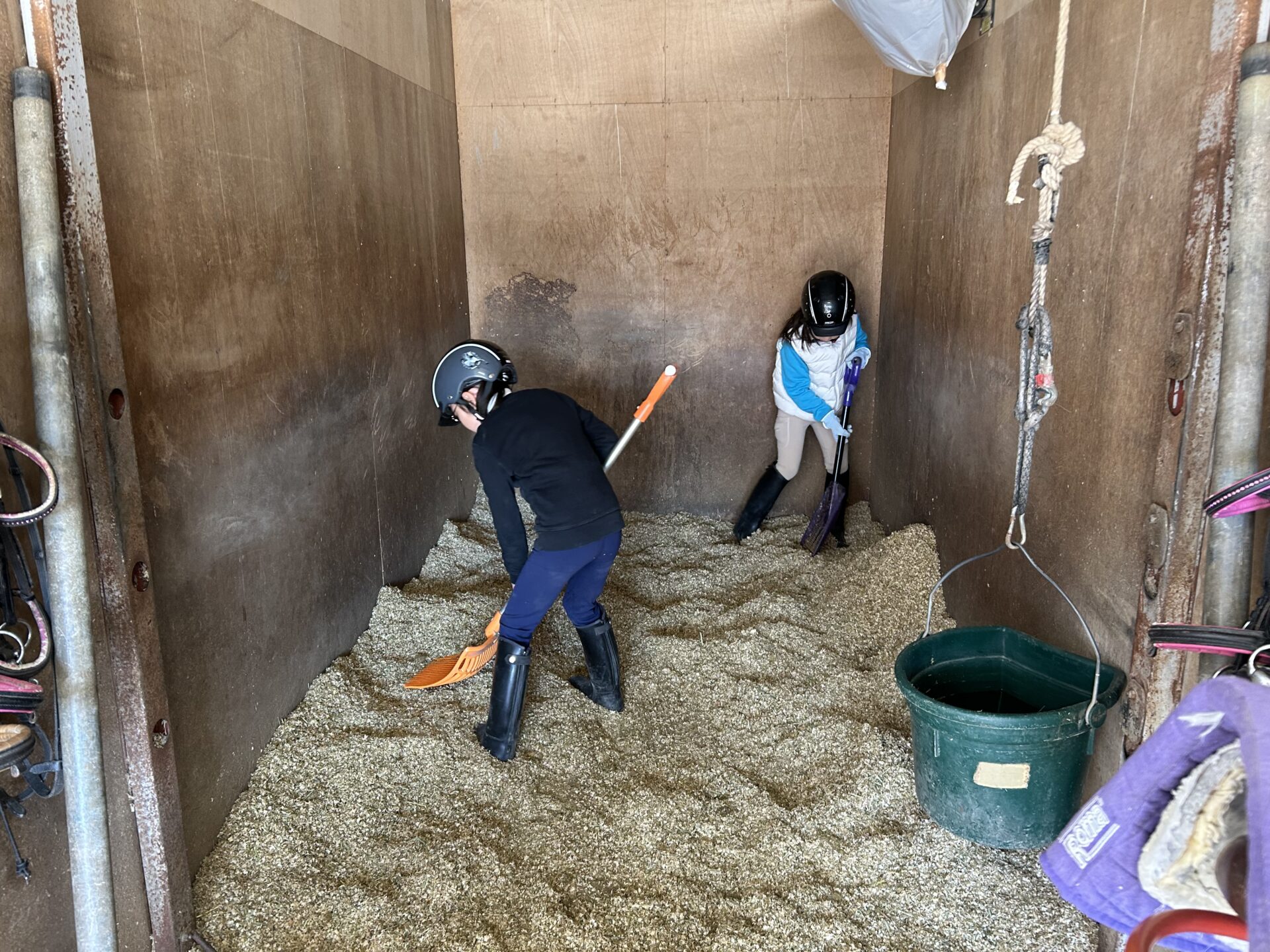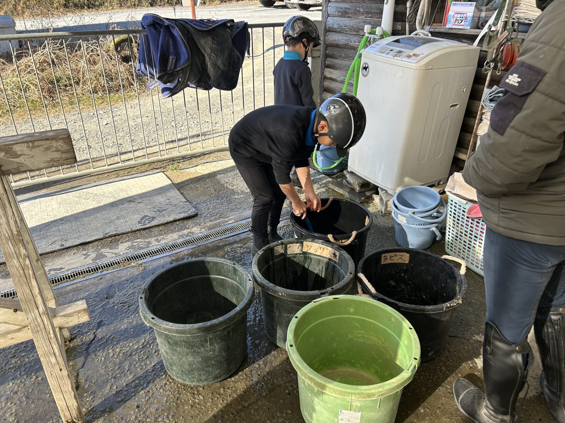 馬房の掃除、飼桶や水桶をきれいに洗ったり、飼い(ごはん)を作ったり、馬のブラッシングをして馬装したり、頭絡の分解をして手入れをして組み立てて元に戻すなど、色々な事を学びます。